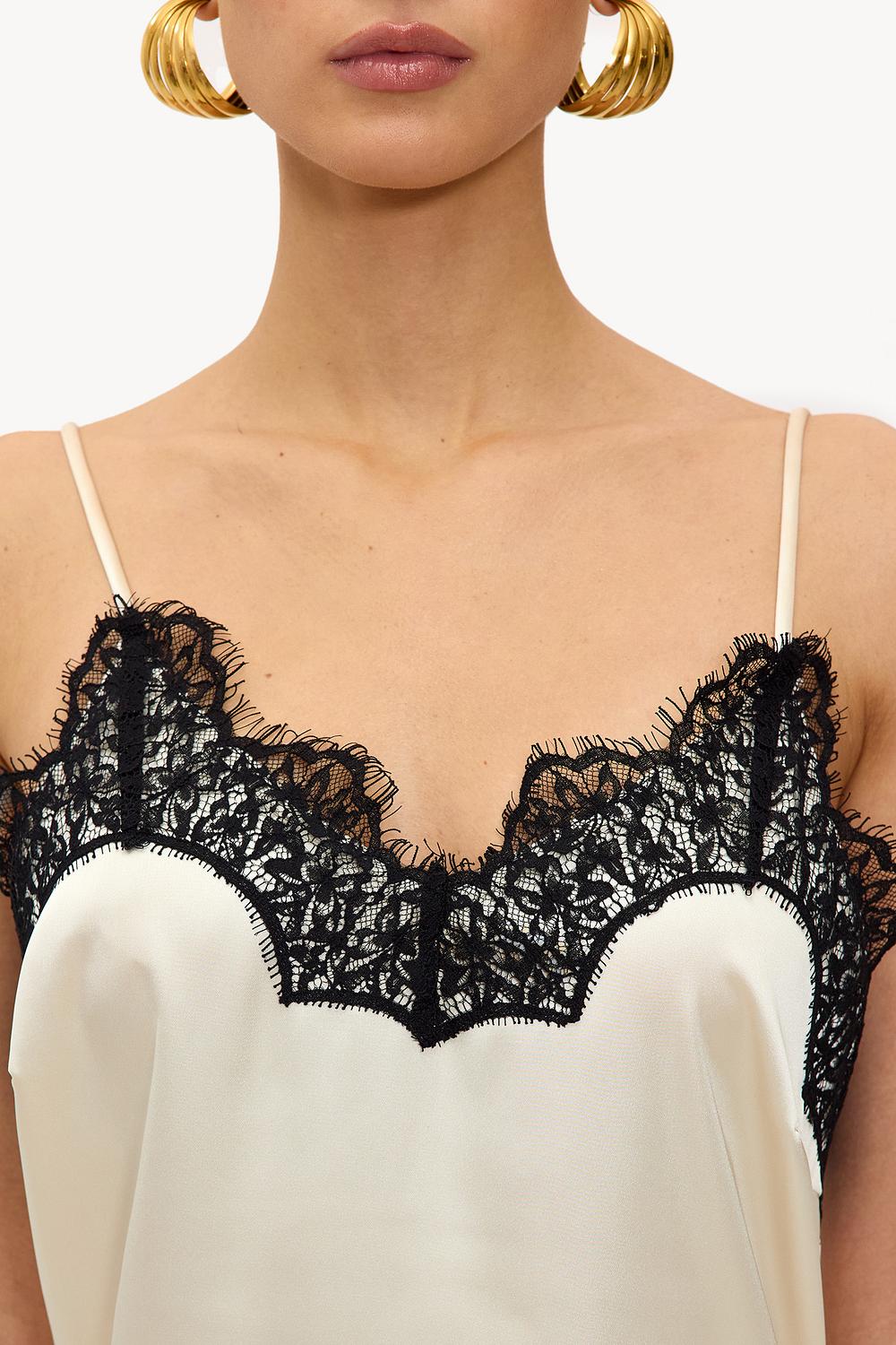 Deze offwhite slip dress heeft opvallende zwarte lace details voor een luxe contrast. De asymmetrische zoom met delicate lace trim creëert een moderne twist op het klassieke slip design. De spaghettibandjes en bodycon fit accentueren de shape op een elegante manier. Style deze dress met statement oorbellen voor een dinner date look.