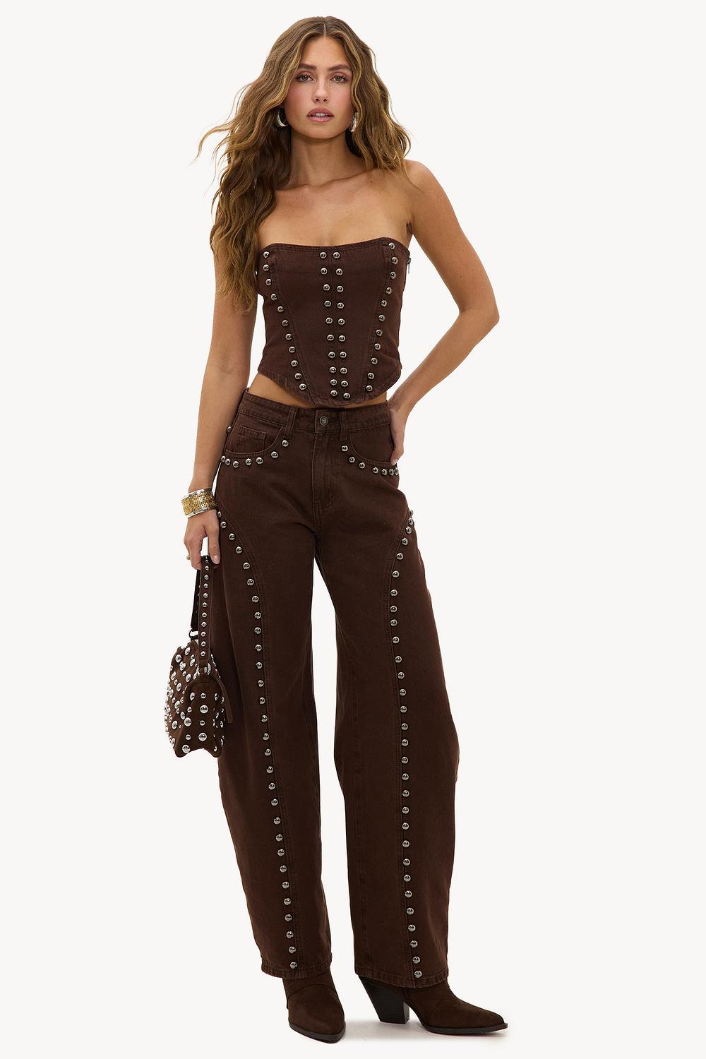 Deze bruine denim corset heeft opvallende studs all over voor een edgy statement look. De strapless fit met structured design accentueert de shape op een moderne manier. De katoenen blend zorgt voor comfort en een luxe uitstraling. Style deze corset met de matching balloon jeans voor een stunning co-ord look.
