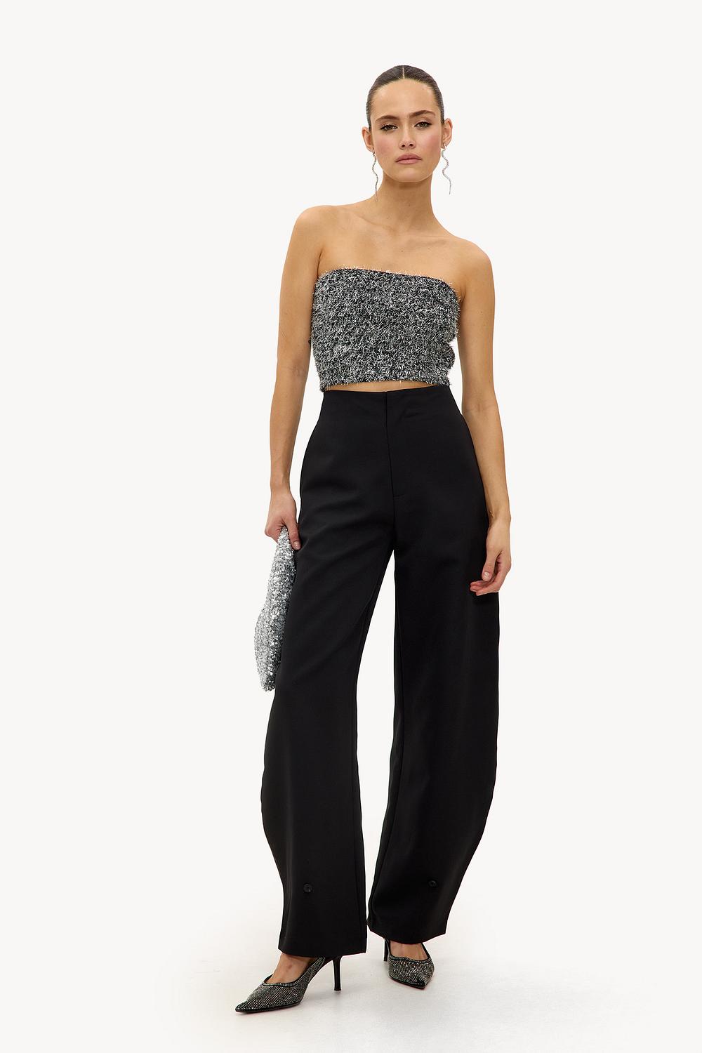 Zwarte bandeau top met zilveren lurex garen EUR 35,99Deze zilveren strapless crop top heeft een zachte lurex textuur met shimmering effect voor een statement look. De bandeau-style pasvorm met elastische band zorgt voor een comfortabele fit. De cropped lengte creëert een moderne shape die perfect combineert met high-waisted broeken. Style deze top met zwarte wide leg pants voor een chique girls night out look.