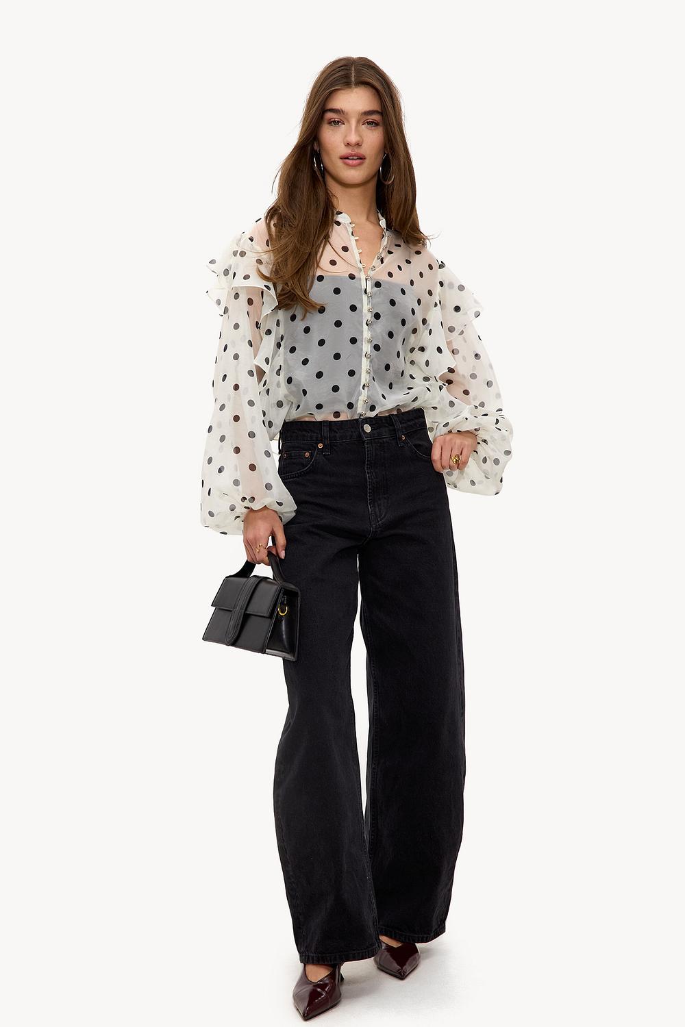 Deze transparante blouse heeft een opvallende polkadot print met dramatic ruffle details op de mouwen. De statement balloon sleeves en knoopsluiting aan de voorzijde geven deze blouse een romantische twist. De losse fit creëert een chique uitstraling die perfect te combineren is met een high-waisted jeans. Style deze blouse met donkere denim voor een coole contrast look.