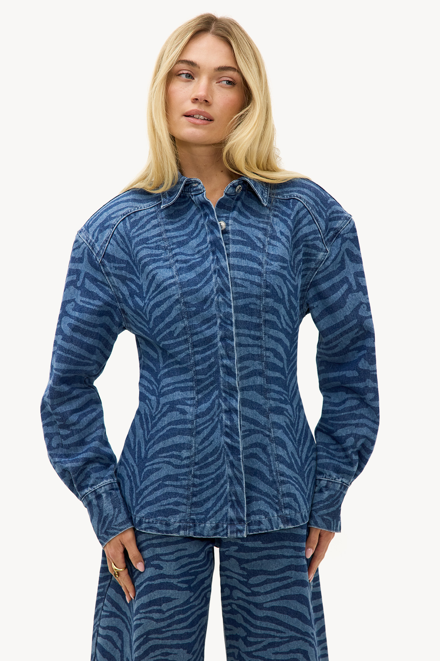Blauwe denim blouse met zebra patroon EUR 59,99Deze blauwe button blouse heeft een opvallende zebra print all over voor een statement look. De tailored fit met klassieke knoopsluiting en lange mouwen creëert een chique uitstraling. De denim-inspired wash geeft deze blouse een cool twist. Style deze blouse met de bijpassende wide leg broek voor een stunning co-ord look.