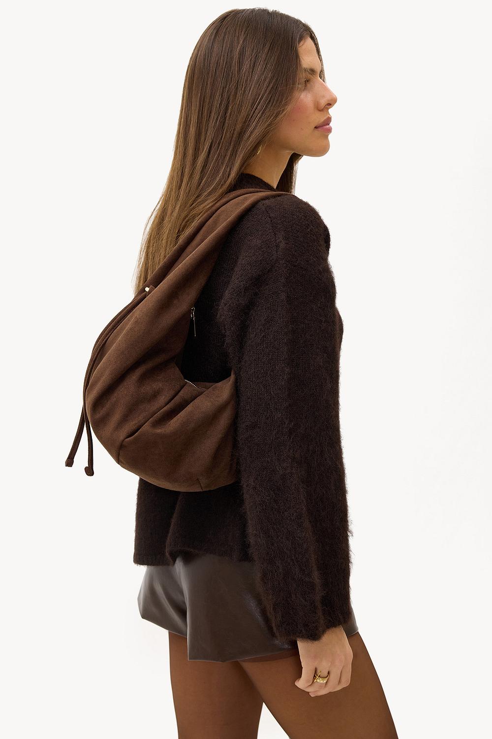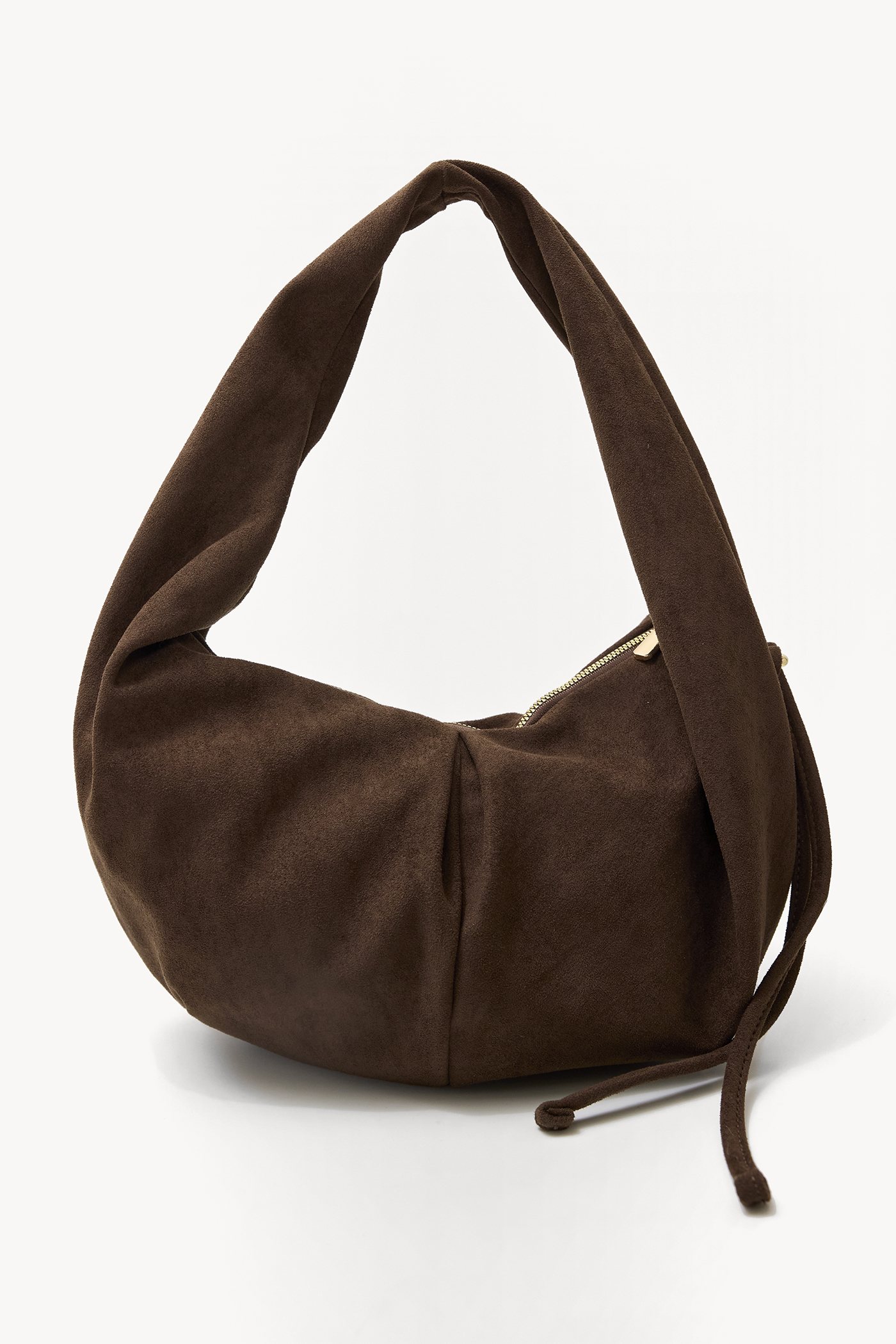 Deze donkerbruine suede-like shoulder bag heeft een zachte rounded shape met statement draagband. Het oversized design met trekkoord sluiting creëert een relaxed hobo-style look. De ruime pasvorm biedt volop ruimte voor je essentials en geeft elke outfit een chique casual touch.