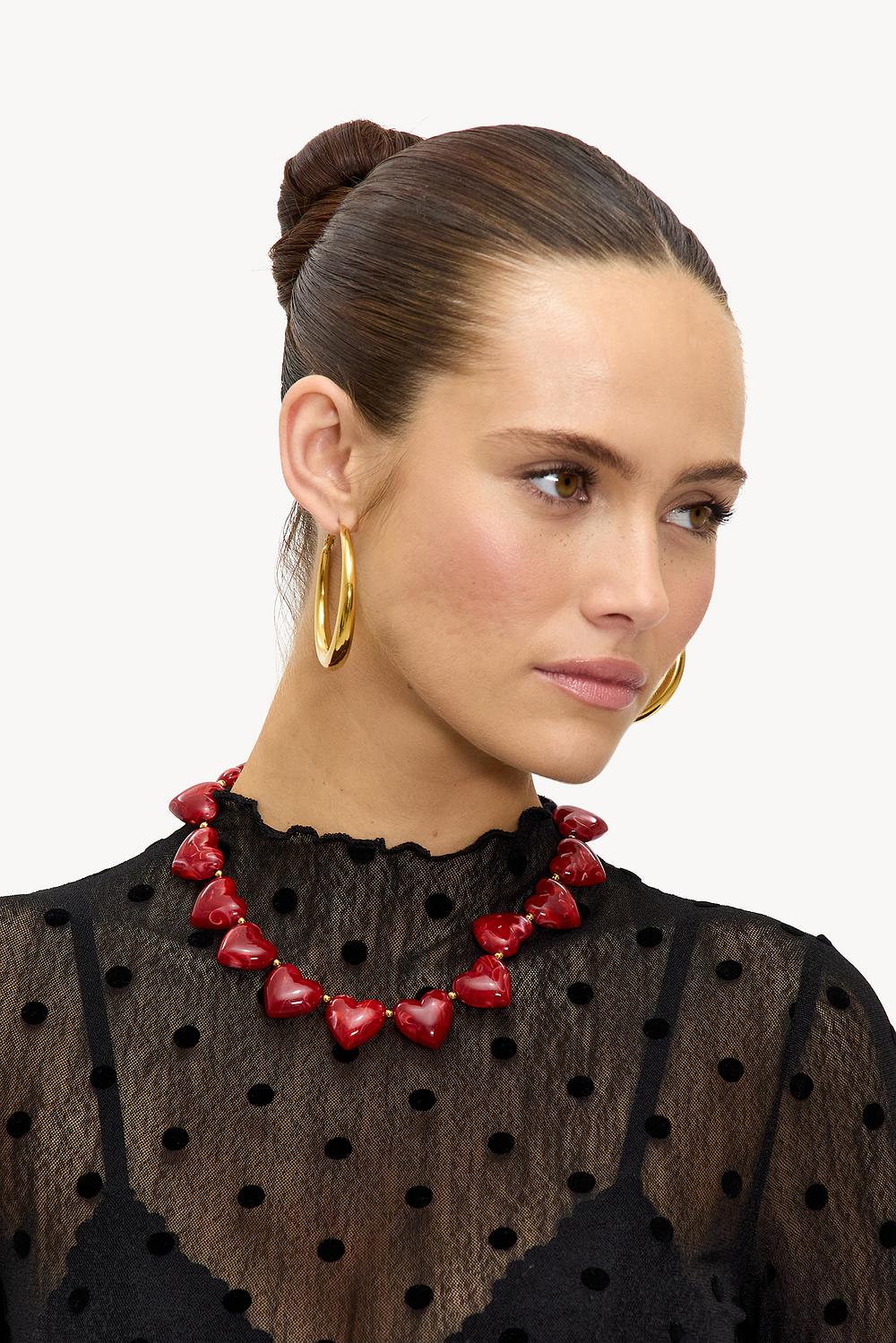 Deze bordeaux statement necklace heeft opvallende hart-vormige elementen all over voor een romantische twist. De goudkleurige sluiting en adjustable lengte maken dit accessoire perfect voor verschillende looks. De bold hartjes geven elke outfit een coole update. Style deze necklace met een zwarte blouse voor een chique contrast.
