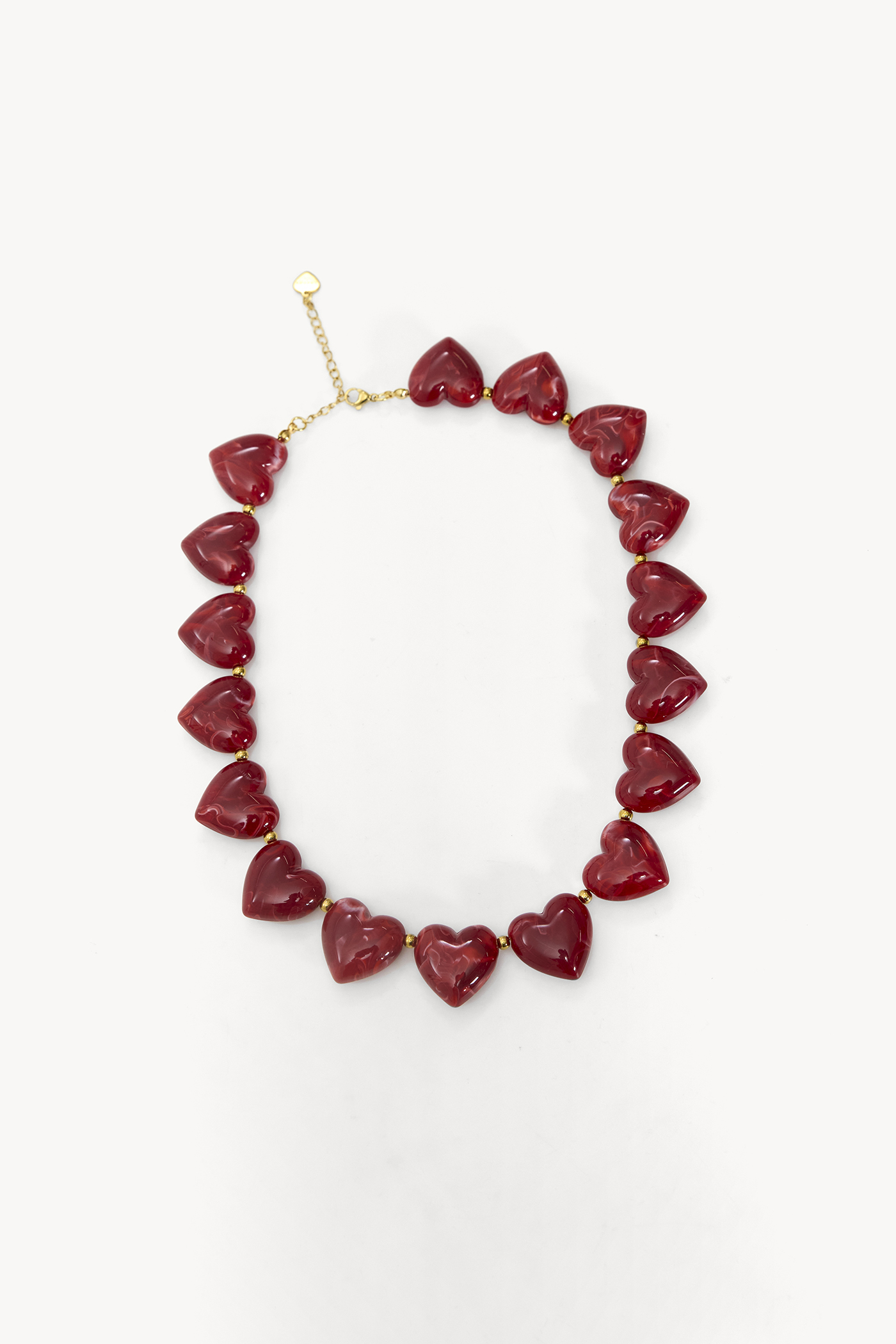 Deze bordeaux statement necklace heeft opvallende hart-vormige elementen all over voor een romantische twist. De goudkleurige sluiting en adjustable lengte maken dit accessoire perfect voor verschillende looks. De bold hartjes geven elke outfit een coole update. Style deze necklace met een zwarte blouse voor een chique contrast.