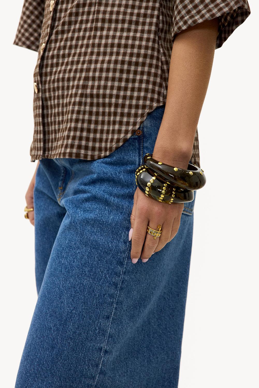 Deze statement armband set heeft opvallende gouden studs op zwarte banden voor een edgy look. De mix van plastic en stainless steel goldplated zorgt voor een luxe afwerking met rock-chic attitude. De brede fit creëert een bold accent aan je pols. Style deze armbanden met een oversized blazer en straight jeans voor een coole contrast look.