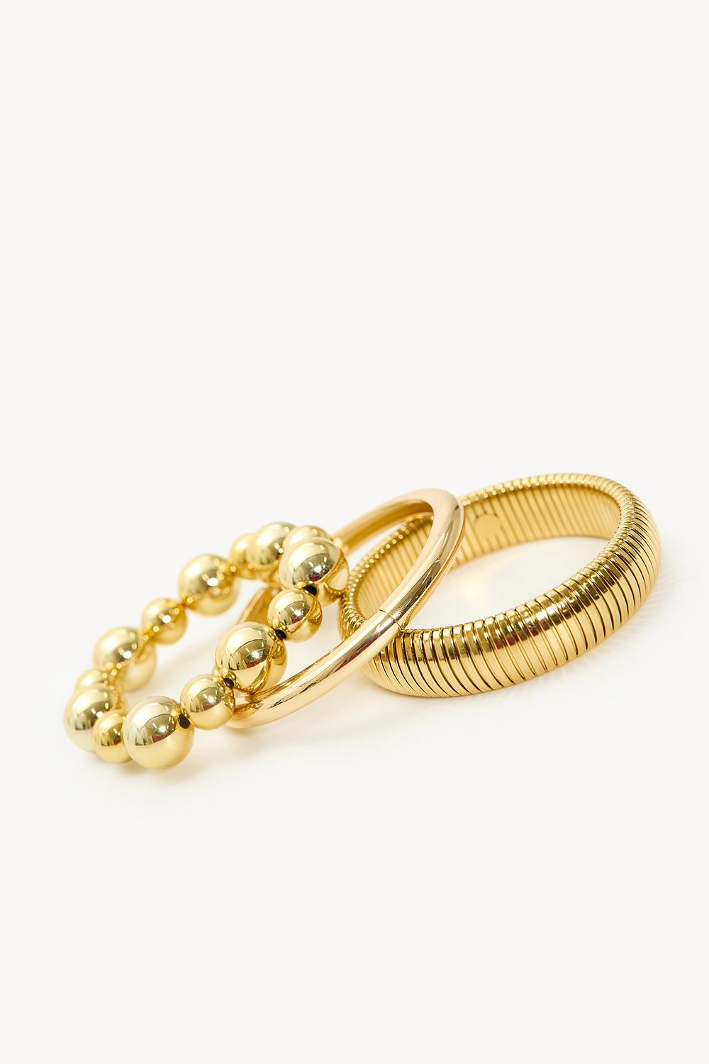 Deze gouden bracelet set bestaat uit twee statement armbanden met verschillende texturen. De eerste armband heeft een bold beaded design met glanzende bollen, terwijl de tweede een sleek ribbed patroon toont. De gouden afwerking geeft beide armbanden een luxe uitstraling. Style deze set samen voor een layered look of draag ze apart voor een subtiele touch.