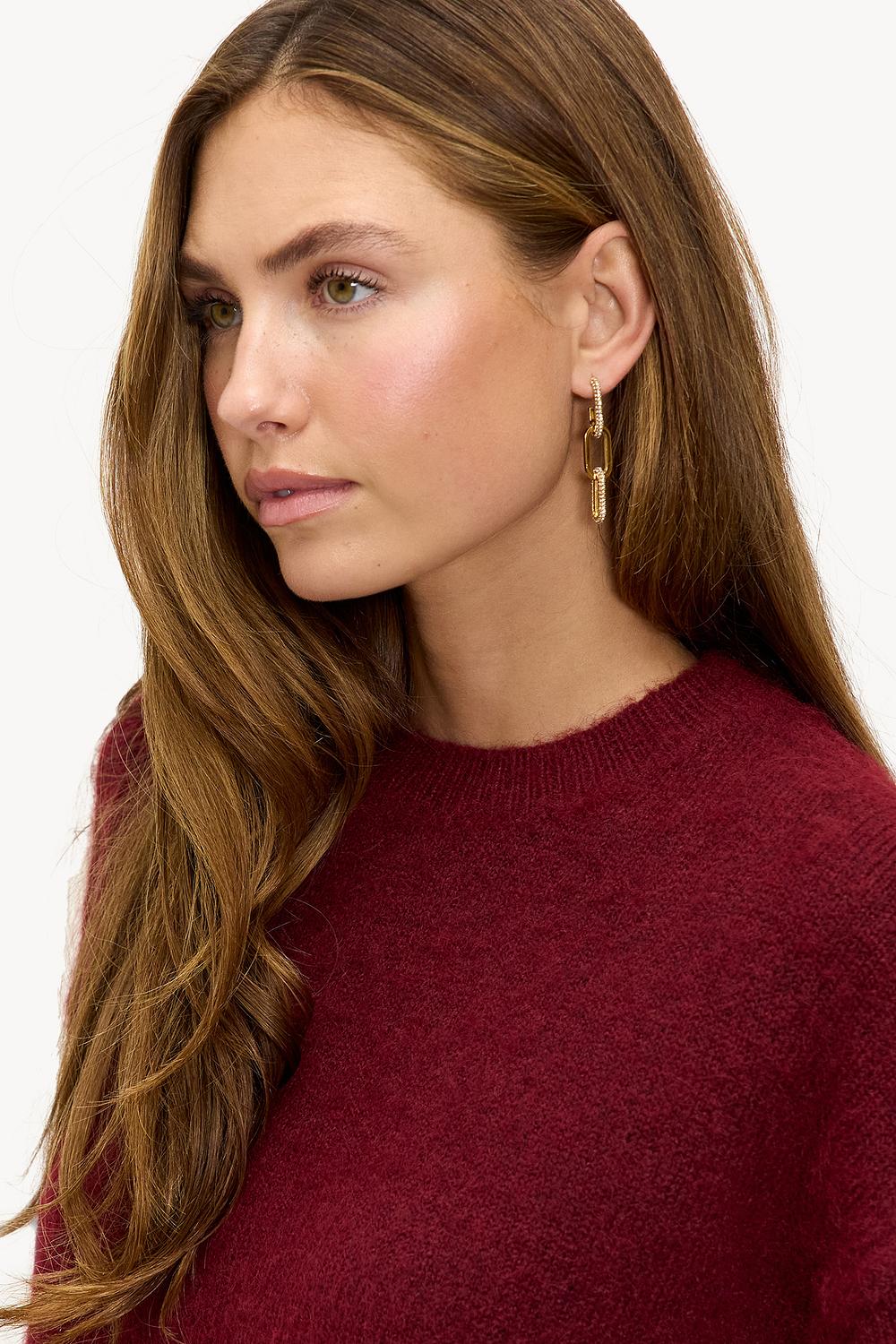 Gouden oorbellen met strass steentjes EUR 17,99Deze gouden statement oorbellen hebben een moderne chain design met hangende ovale elementen. De opvallende link structuur creëert beweging en geeft elke outfit een luxe twist. Perfect voor zowel casual als chique looks.
