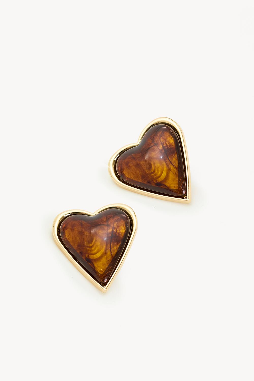 Deze statement oorbellen hebben een opvallend hartvormig design met amber-kleurige accenten. De goudkleurige omlijsting contrasteert mooi met het warme bruine hart voor een luxe uitstraling. De 100% stainless steel goldplated kwaliteit zorgt voor duurzaamheid en een premium finish. Perfect om je casual outfit een romantische twist te geven.
