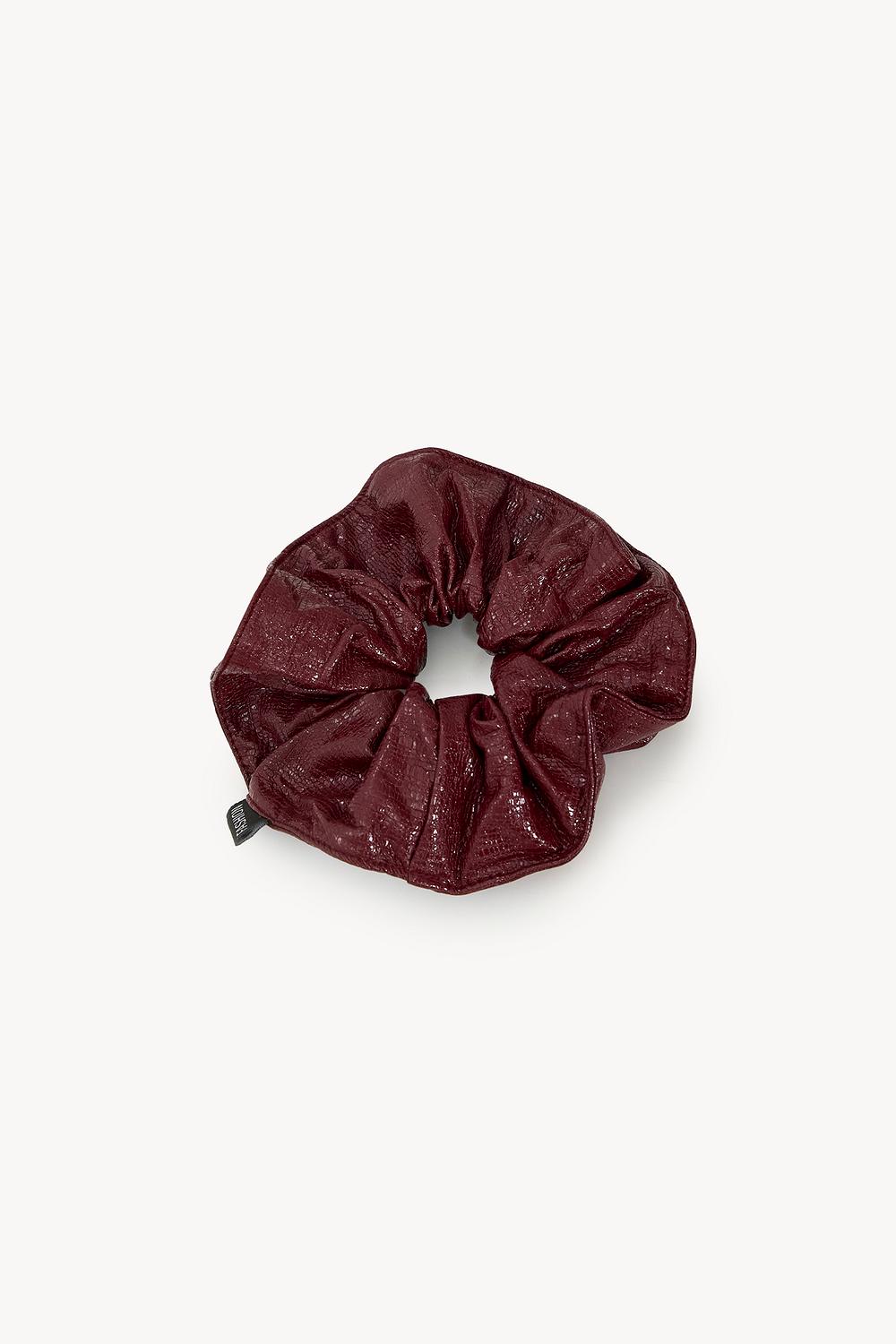 Deze bordeaux scrunchie heeft een luxe leather-look finish voor een chique touch. Het polyurethaan design geeft extra volume en zorgt voor een statement look in je haar. Perfect om je ponytail of bun een instant upgrade te geven met dit coole accessoire.