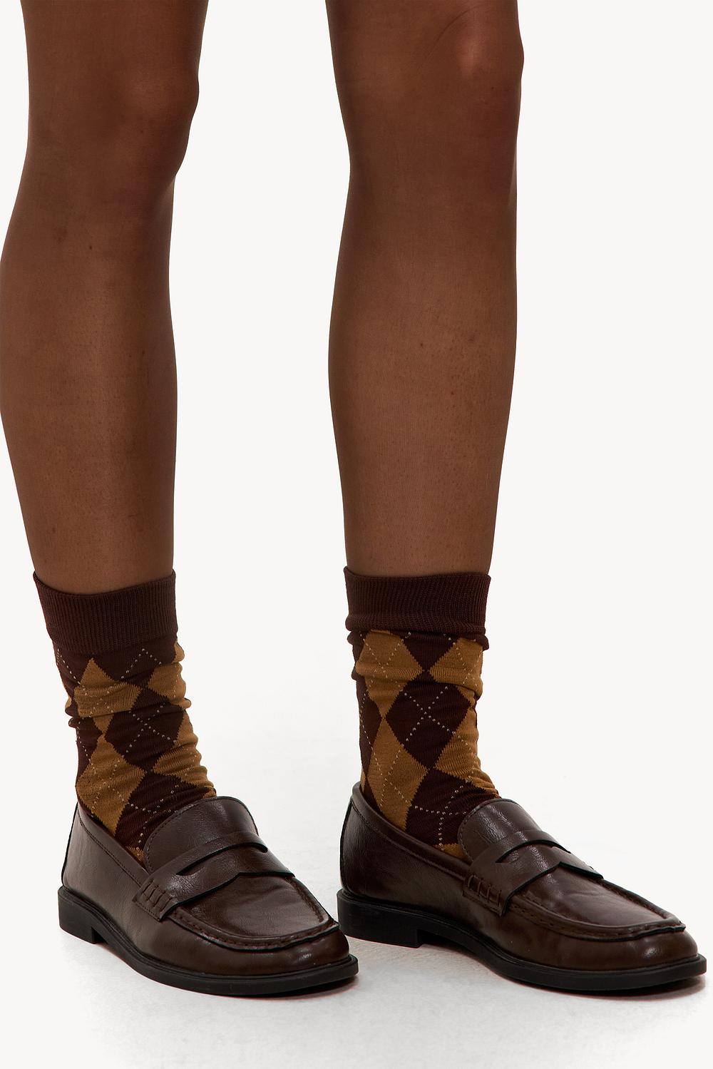 Deze bruine sokken hebben een klassiek argyle patroon in warme bruintinten voor een preppy look. De katoenen kwaliteit zorgt voor comfort en ademend draaggemfort. De tijdloze ruit print geeft een chique twist aan je outfit. Style deze sokken met loafers en een oversized knit voor een sophisticated look.