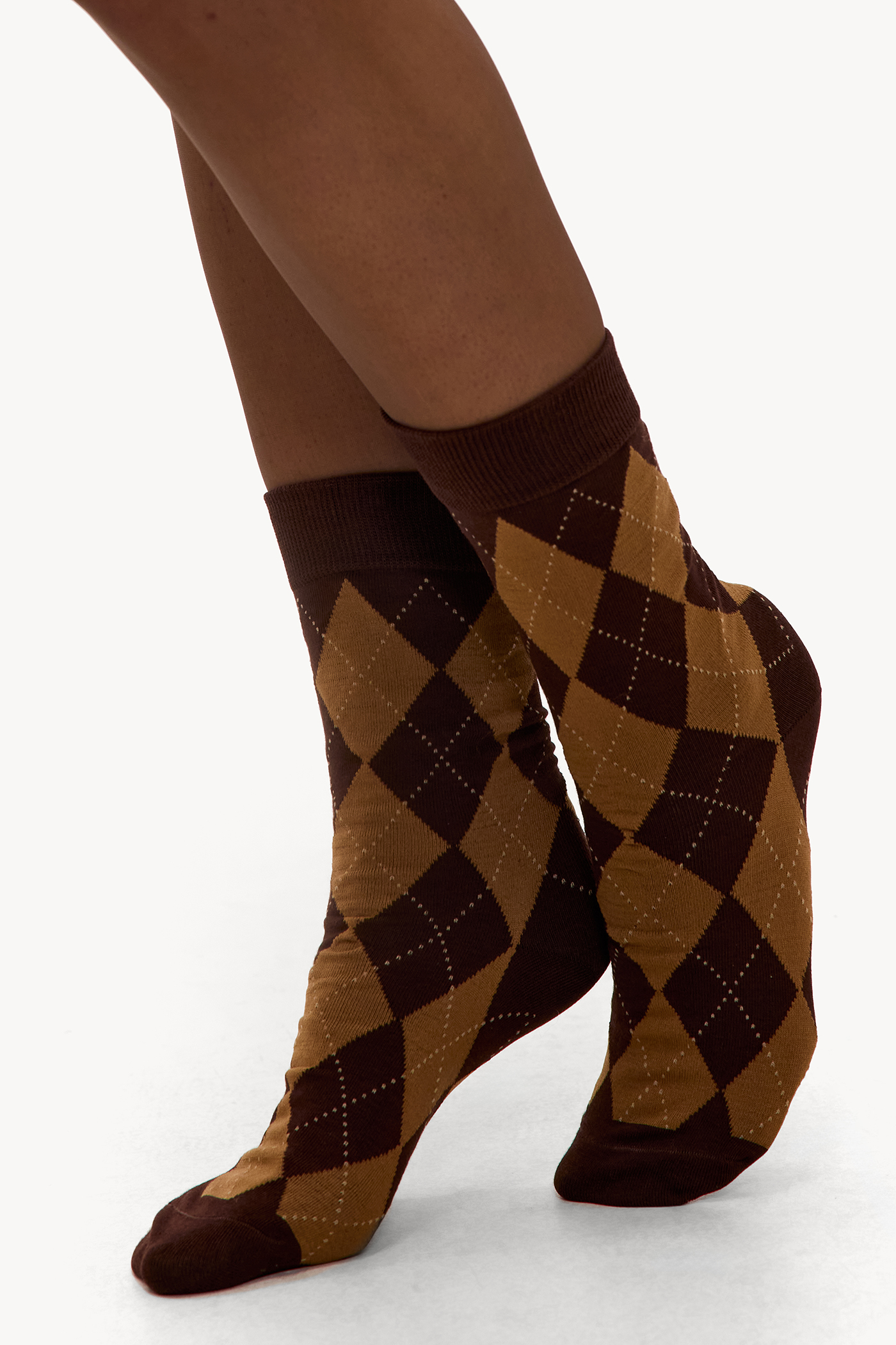 Deze bruine sokken hebben een klassiek argyle patroon in warme bruintinten voor een preppy look. De katoenen kwaliteit zorgt voor comfort en ademend draaggemfort. De tijdloze ruit print geeft een chique twist aan je outfit. Style deze sokken met loafers en een oversized knit voor een sophisticated look.