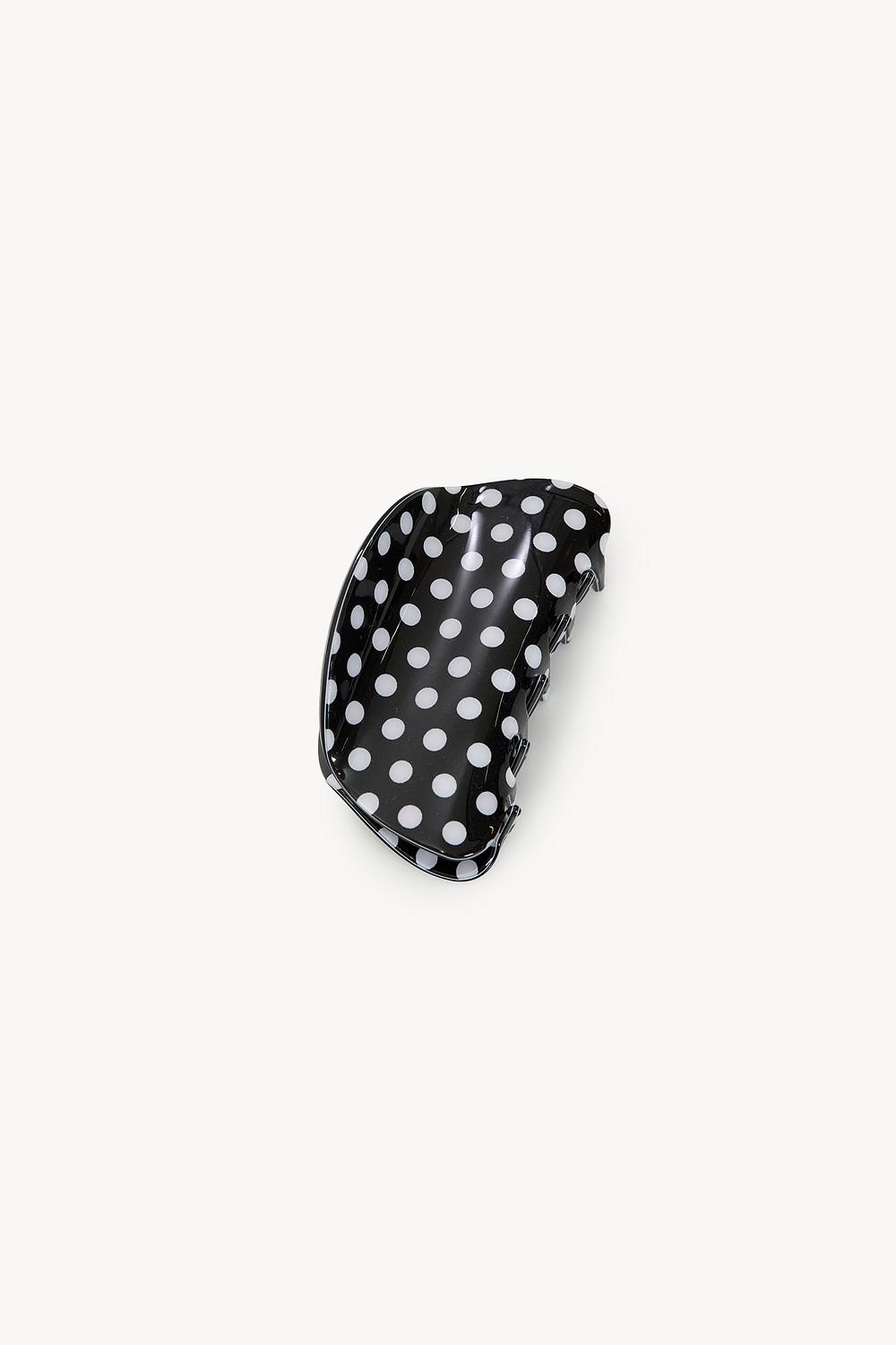 Deze zwarte hair clip heeft een opvallend polkadot design met witte stippen all over. De grote klauwvorm zorgt voor een stevige grip en voegt direct een statement toe aan elke hairstyle. De clip geeft een vintage twist aan zowel casual als chique looks.