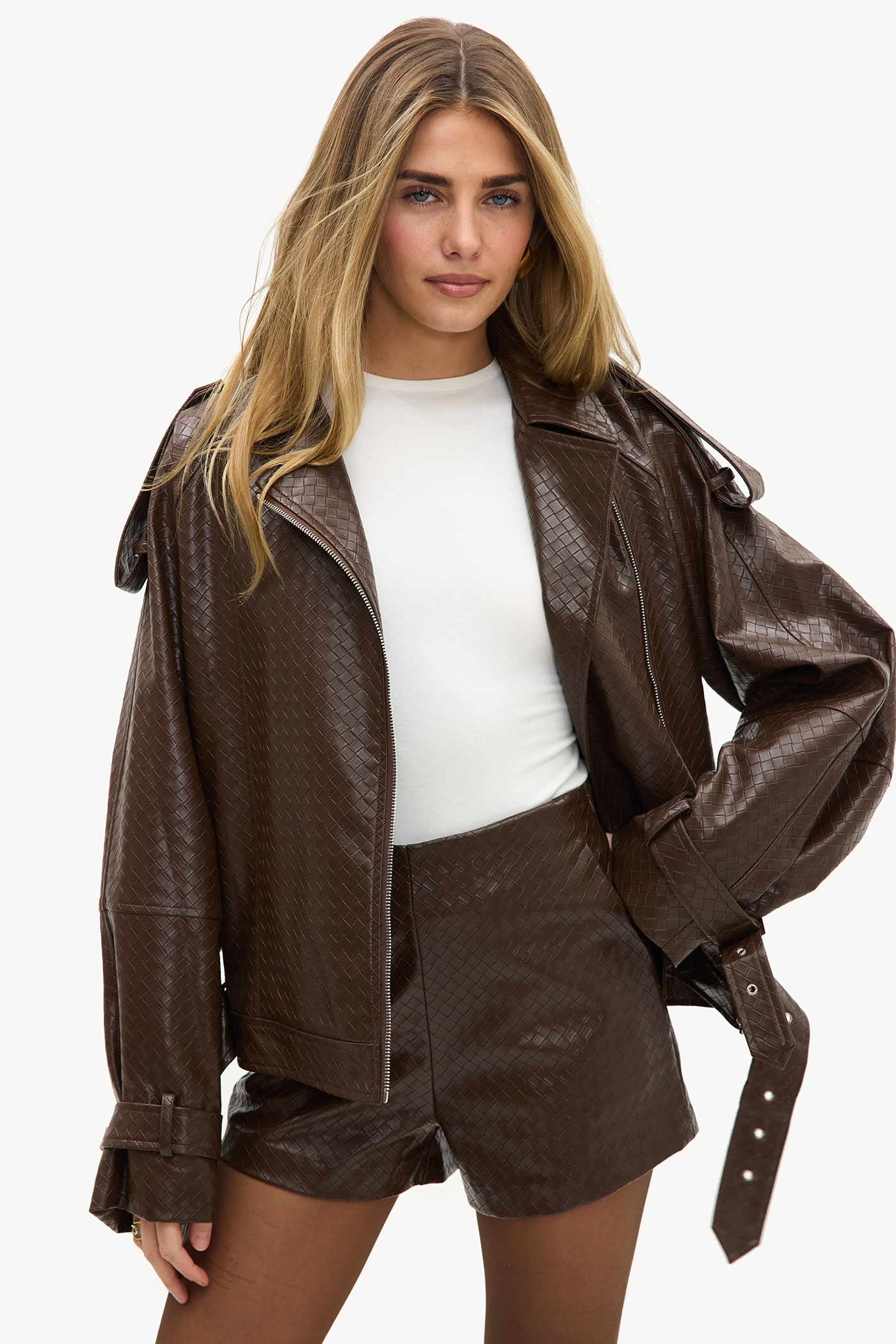 Bruine PU short EUR 39,99Deze donkerbruine leather-look short heeft een luxe quilted design patroon all over. De high-waisted fit met korte pasvorm creëert een edgy look. Style deze short met de bijpassende oversized jacket voor een statement co-ord look.