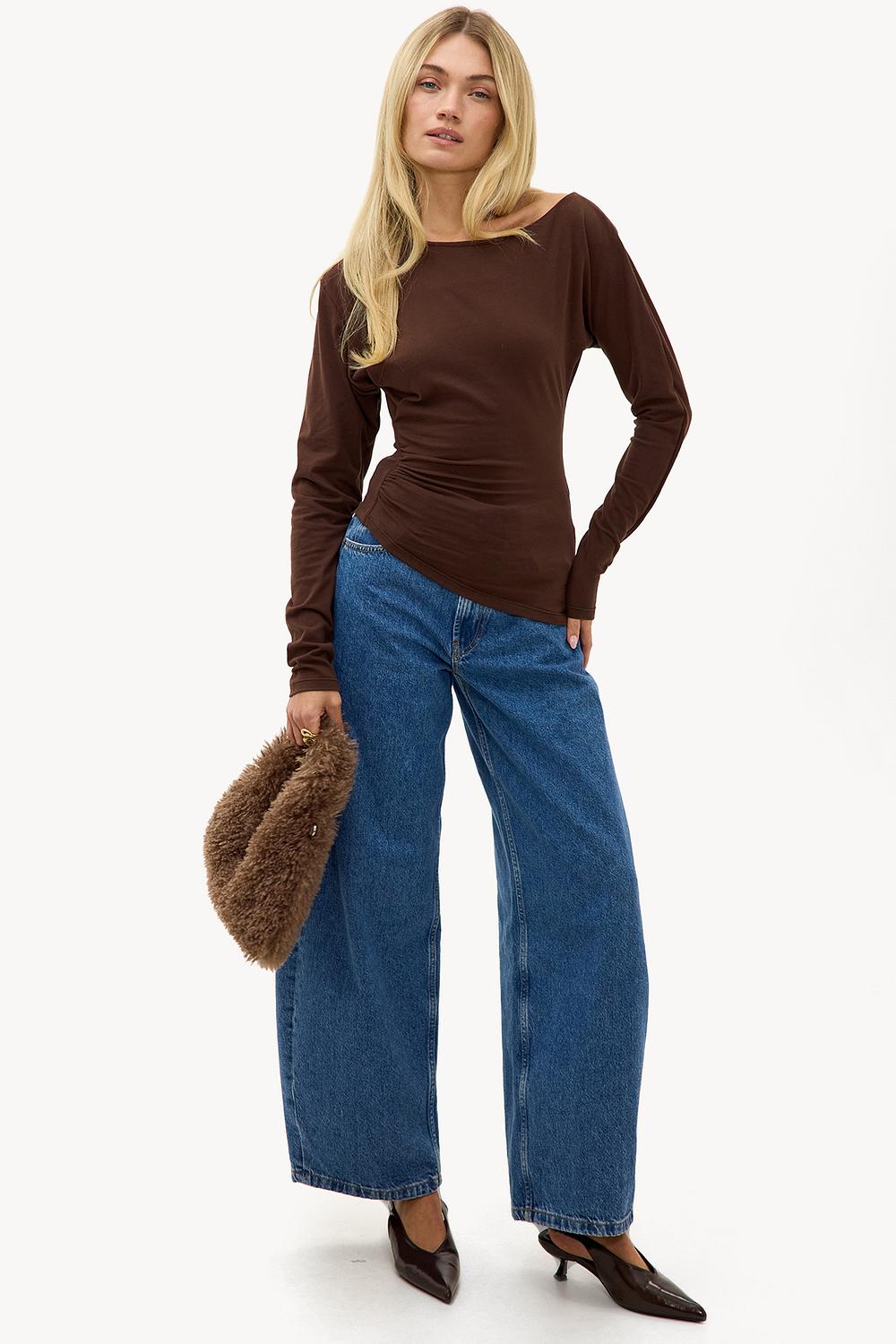 Deze bruine longsleeve top heeft een fitted pasvorm met subtiele ruching details aan de zijkant. De viscose blend zorgt voor een zachte touch en comfortabele stretch. De clean cut met ronde hals geeft deze basic een chique twist. Style deze top met wide leg jeans voor een casual chic look.