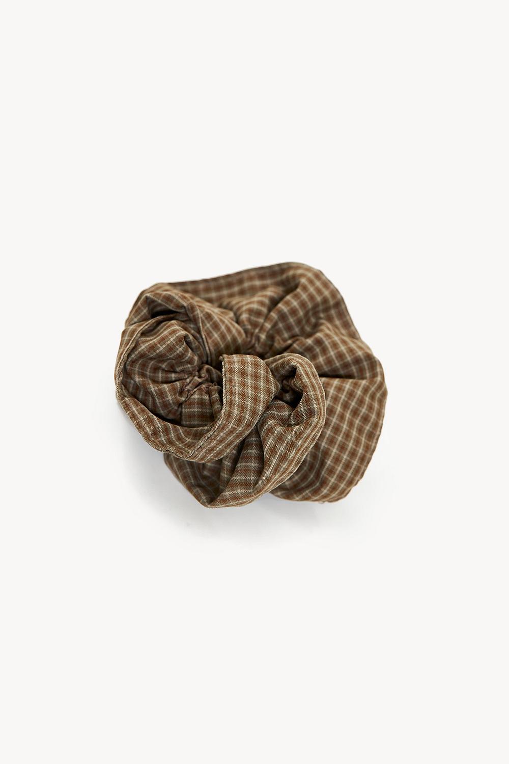 Deze bruine scrunchie heeft een tijdloos gingham print voor een klassieke touch. Het zachte materiaal zorgt voor comfort terwijl je haar wordt beschermd tegen breuk. De oversized vorm creëert volume en geeft elke hairstyle een chique update. Perfect om je look te completeren met een vintage inspired accent.