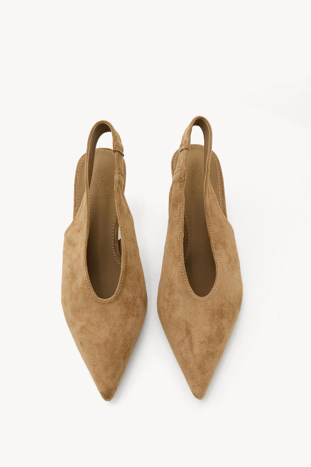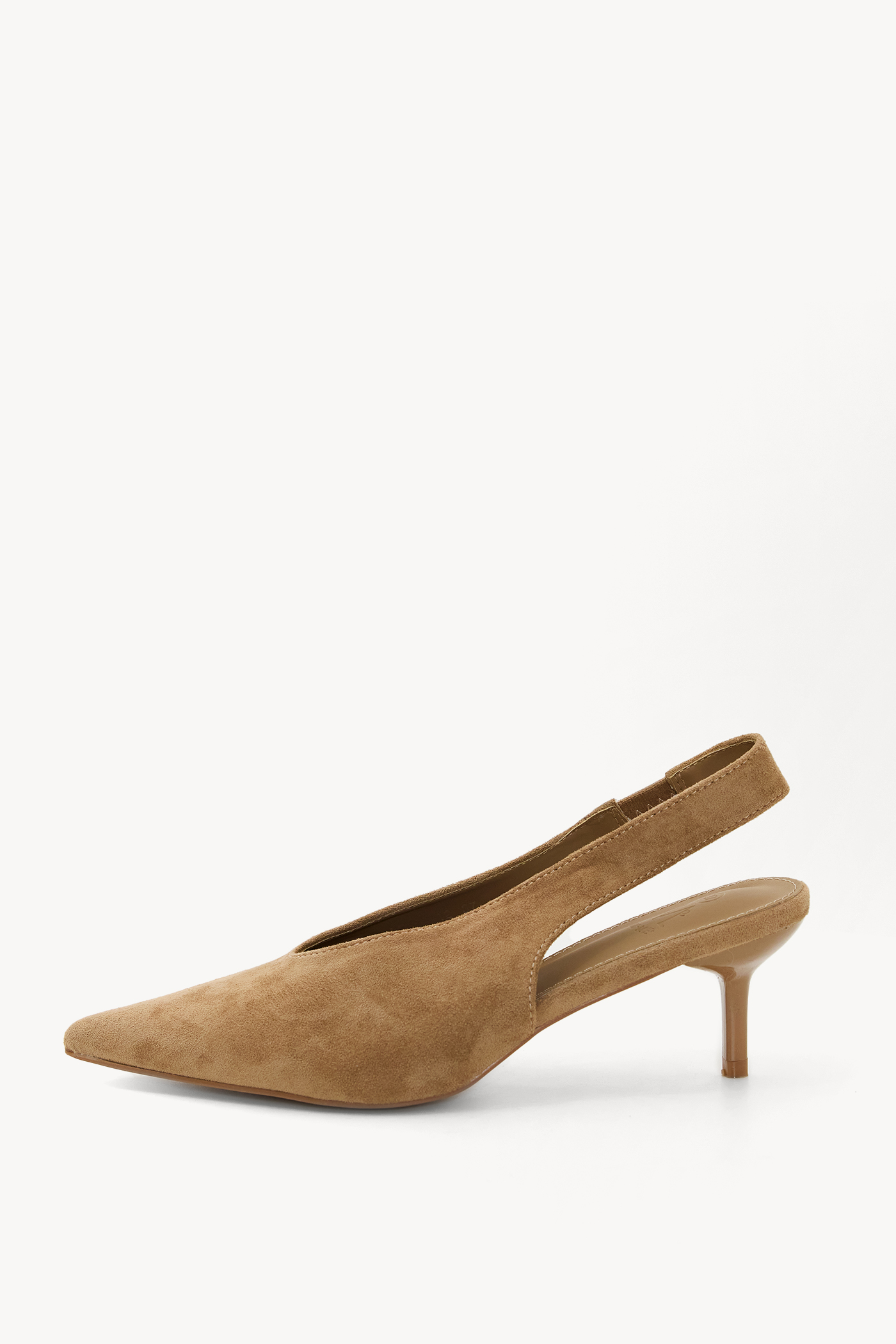 Bruine suèdelook hakken EUR 39,99Deze sand kleurige slingback pumps hebben een suede-like finish voor een luxe uitstraling. De pointed toe en kitten heel geven deze schoenen een chique twist. De elastische slingback zorgt voor comfort en een perfecte fit. Style deze pumps met een midi dress voor een dinner date look.