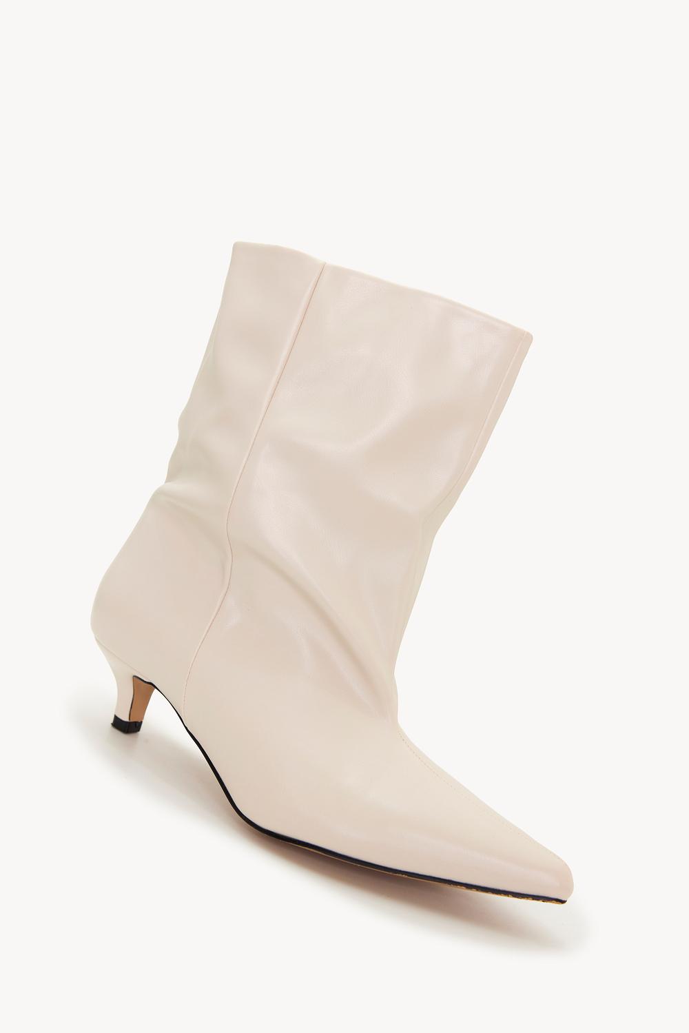 Deze beige heeled ankle boots hebben een pointed toe en kitten heel voor een chique uitstraling. De slouchy fit met zachte rimpels geeft deze boots een relaxed maar verfijnde look. De subtiele hak en tijdloze beige kleur maken deze boots perfect voor zowel casual als dressed-up outfits. Style ze met een wide leg jeans en oversized blazer voor een effortless chic look.