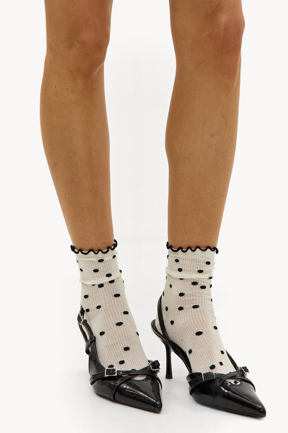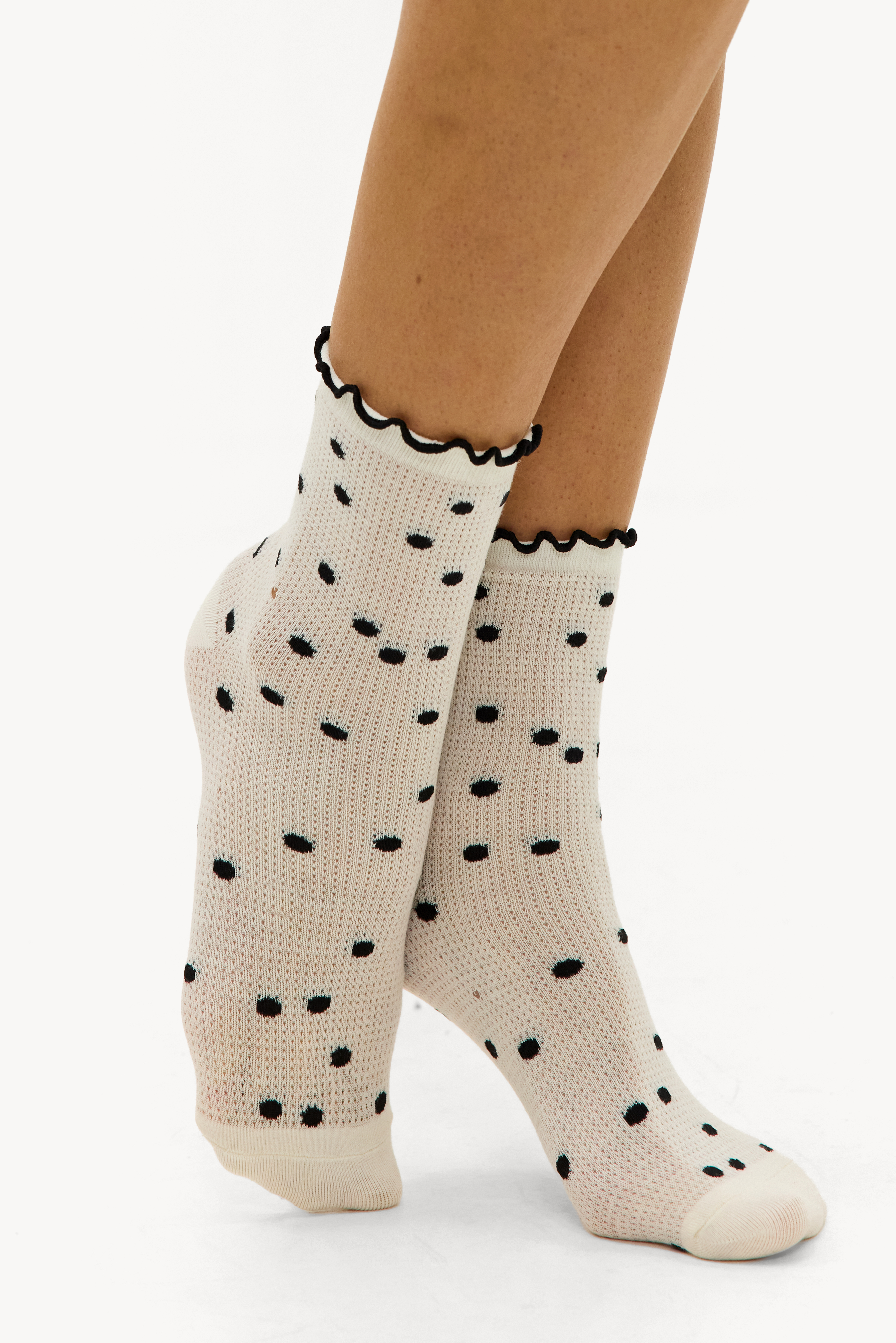Deze witte sokken hebben een charmante polkadot print all over voor een vintage touch. De zwarte randjes geven een extra feminine detail aan het design. Deze statement sokken zijn perfect om je outfit een coole twist te geven. Style ze met pointed heels en een mini dress voor een on trend look.
