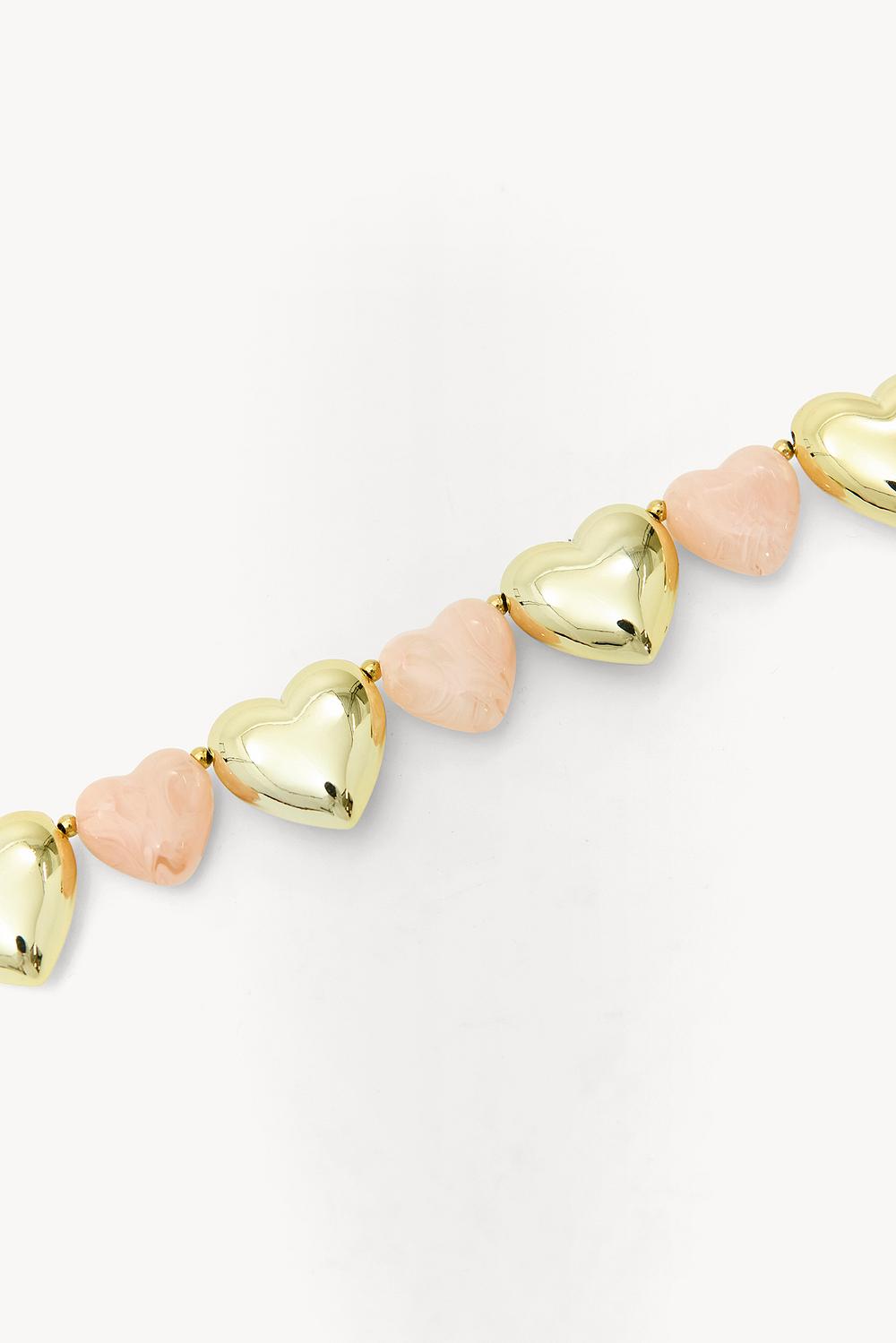 Deze gouden armband heeft een opvallend hart design met afwisselende gouden en lichtroze hartjes. De 100% roestvrijstalen basis met goudplating zorgt voor een luxe uitstraling en duurzaamheid. De verstelbare sluiting met verlengketting maakt deze armband perfect voor elke polsmaat. Style deze statement armband met de bijpassende ring voor een complete romantic look.