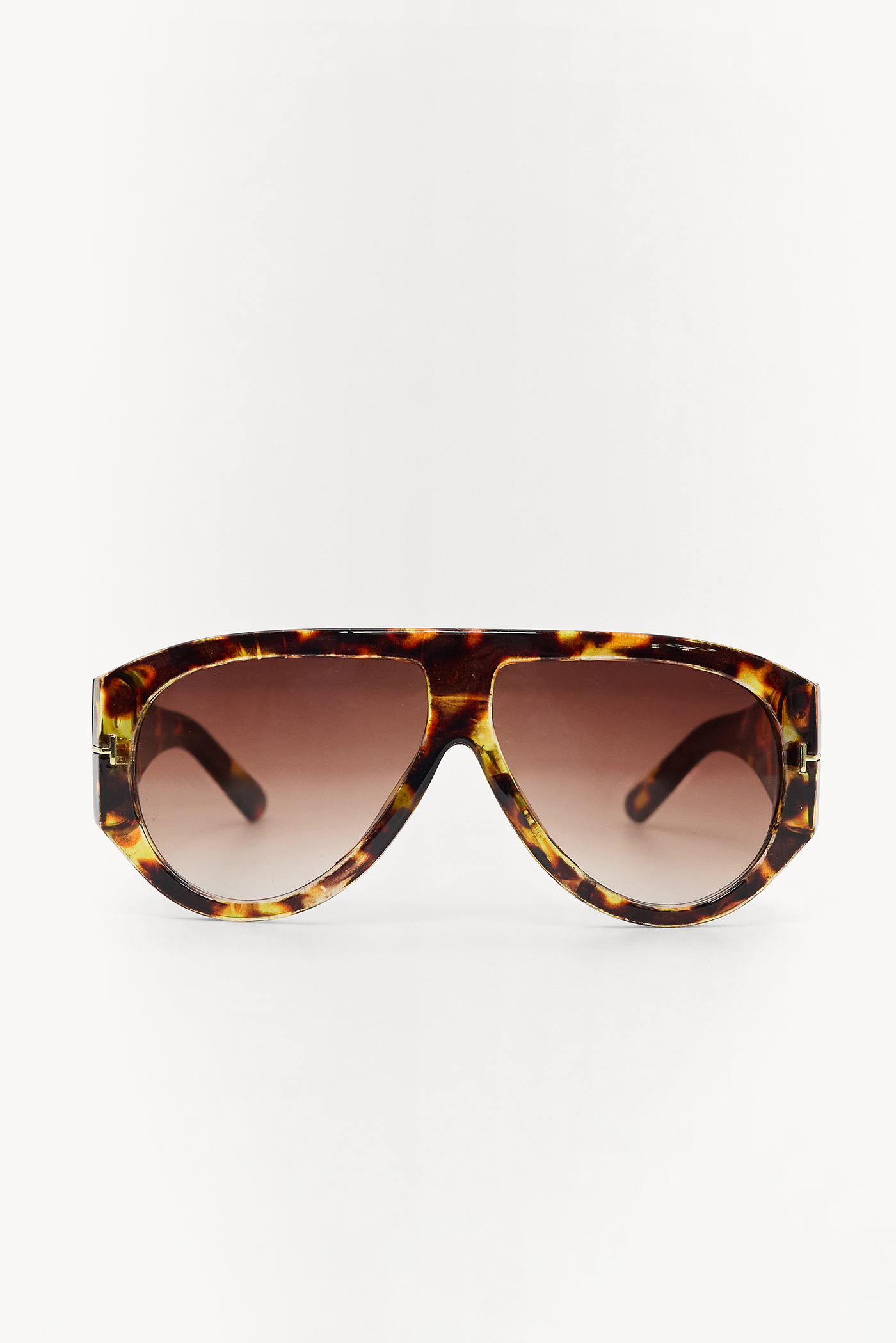 Bruine zonnebril EUR 16,99Deze bruine zonnebril heeft een opvallende tortoiseshell print met statement aviator shape. Het oversized montuur van 100% acetaat zorgt voor een luxe uitstraling en optimale bescherming. De glazen geven een chique finish aan dit iconic design. Style deze zonnebril met gouden sieraden voor een complete glamorous look.