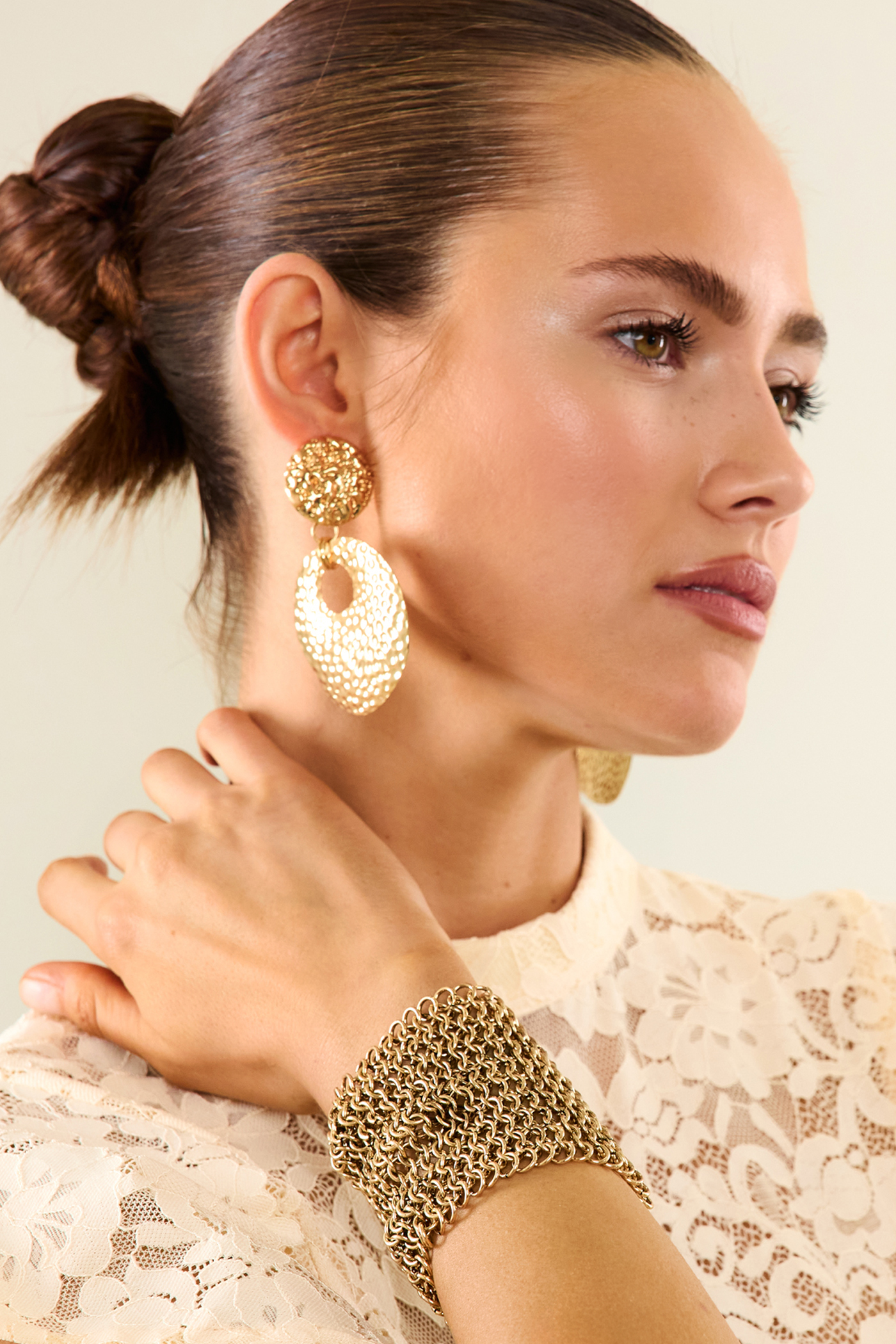 Deze gouden chain armband heeft een opvallend chainmail design met fijne schakels voor een luxe uitstraling. De brede pasvorm met statement sluiting creëert een bold look aan je pols. De 100% metalen kwaliteit zorgt voor duurzaamheid en een high-end finish. Style deze armband met gouden oorbellen voor een complete golden hour look.