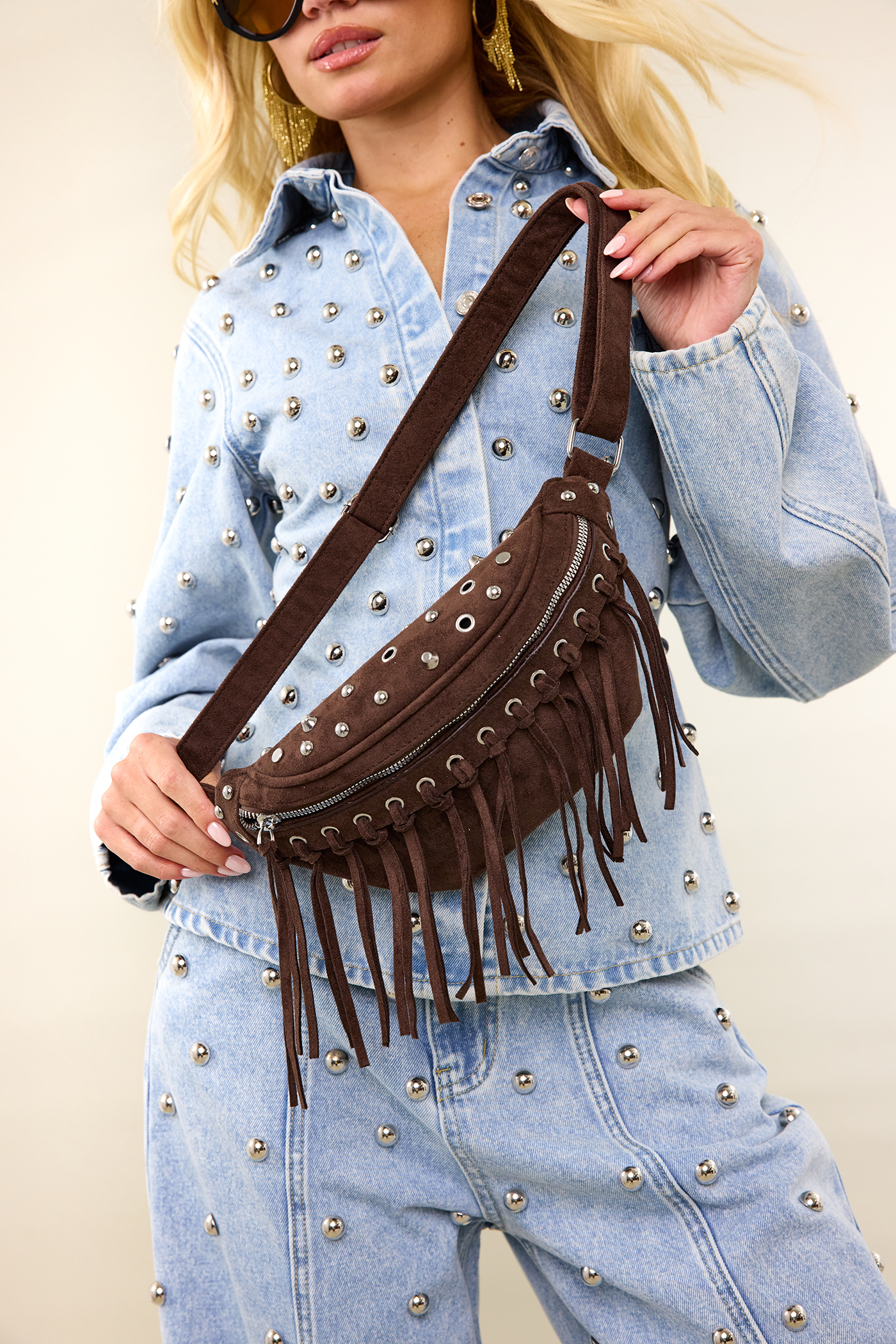 Deze donkerbruine suede-like bum bag heeft opvallende studs all over en statement fringes voor een edgy look. De compacte pasvorm met bewegende franje details creëert een coole rock-chic uitstraling. De verstelbare riem zorgt voor comfort en veelzijdigheid in het dragen. Style deze bag crossbody met een denim co-ord voor een festival ready look.