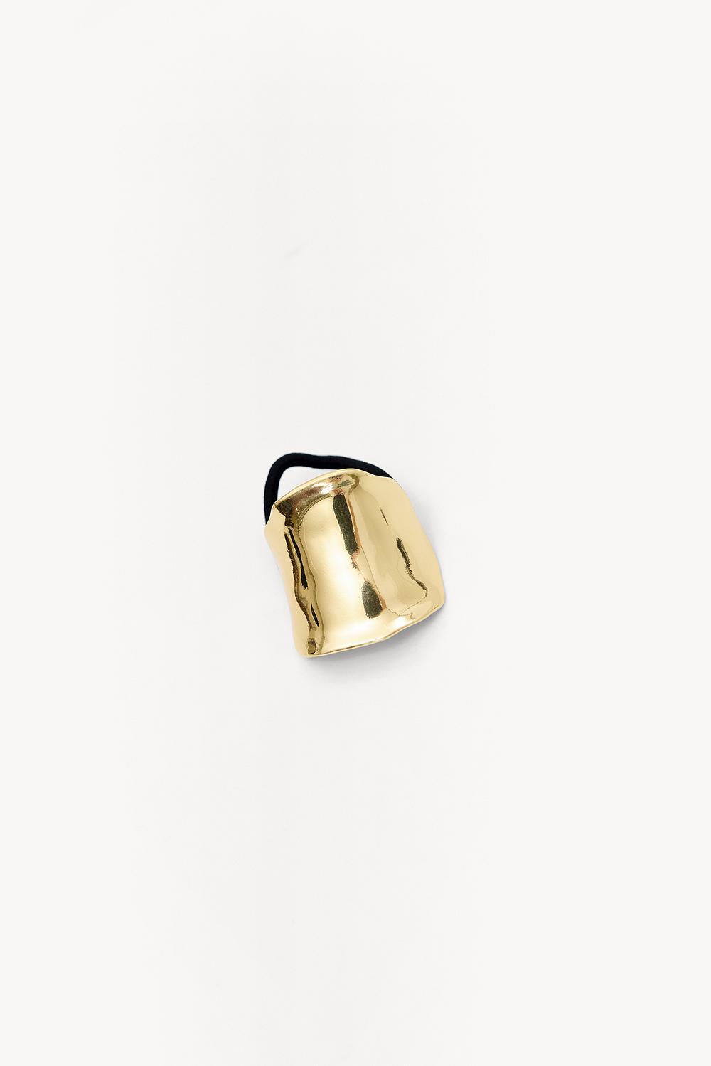 Deze gouden hair tie heeft een luxe goldplated design met een statement metal detail. De 100% stainless steel kwaliteit zorgt voor duurzaamheid en een chique uitstraling. Het minimalistische ontwerp met glanzende afwerking maakt van elke ponytail een sophisticated look. Perfect om je hair game naar een hoger niveau te tillen.