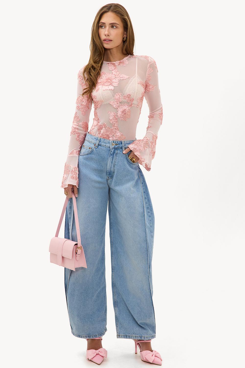 Deze lichtroze mesh top heeft een romantisch bloemendesign met statement bell sleeves. De transparante stof met all-over bloemenprint en bloemen details creëert een feminine look. De fitted pasvorm met lange mouwen zorgt voor een chique uitstraling. Style deze top met high-waisted jeans voor een casual dinner date look.
